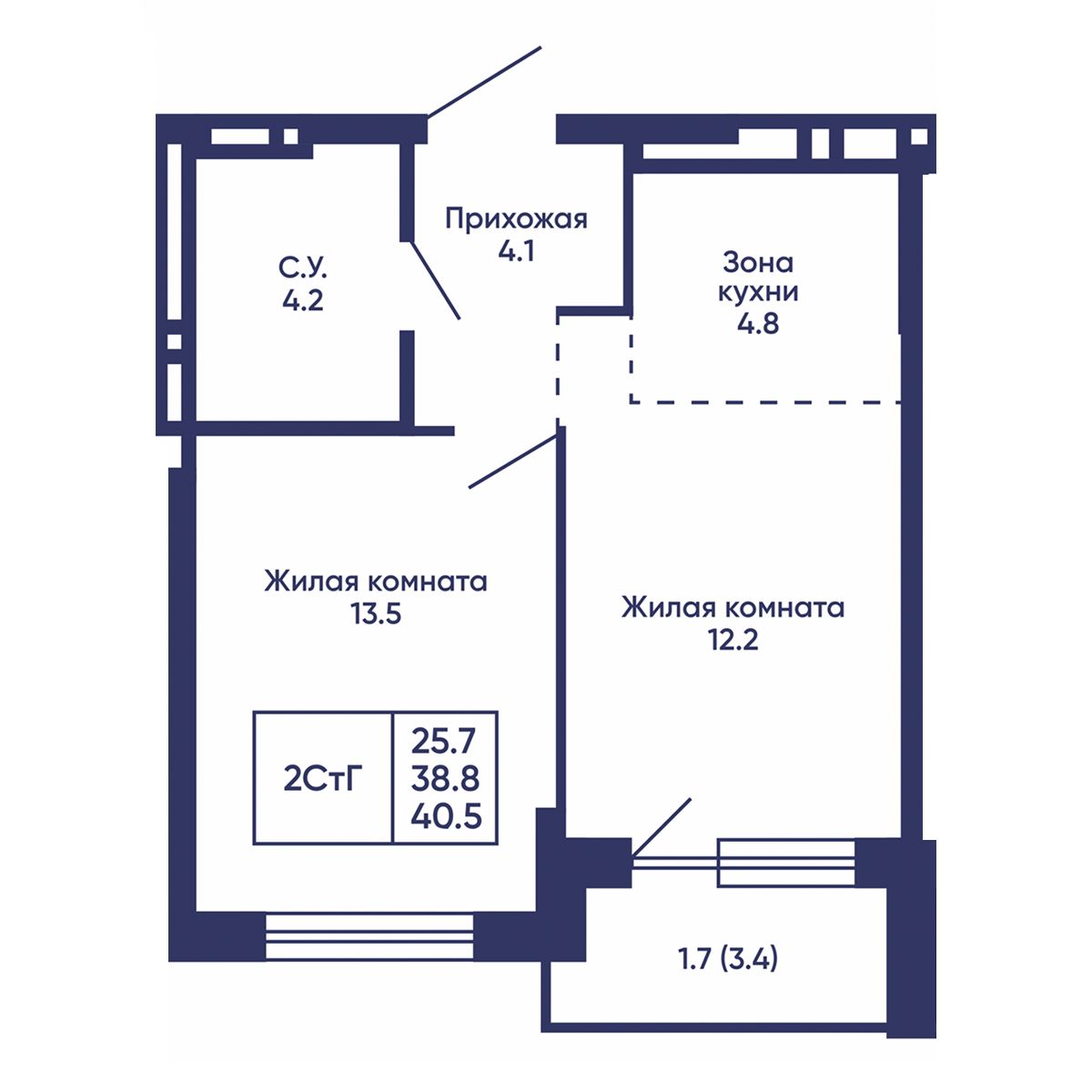 Общая площадь: 40.5 м²
