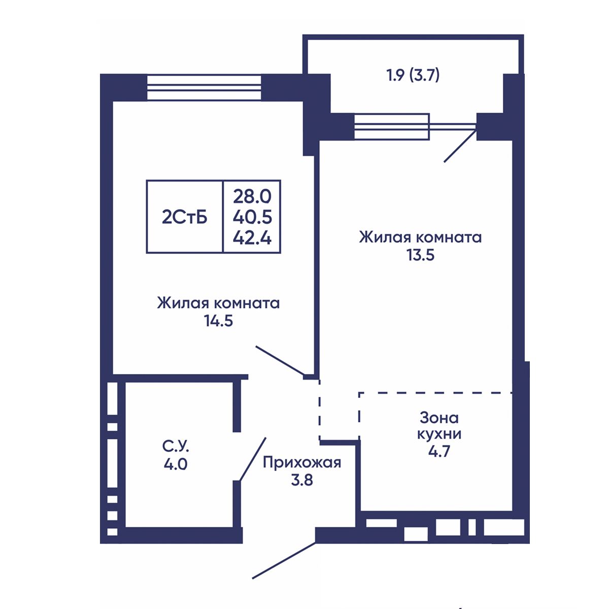 Общая площадь: 42.4 м²