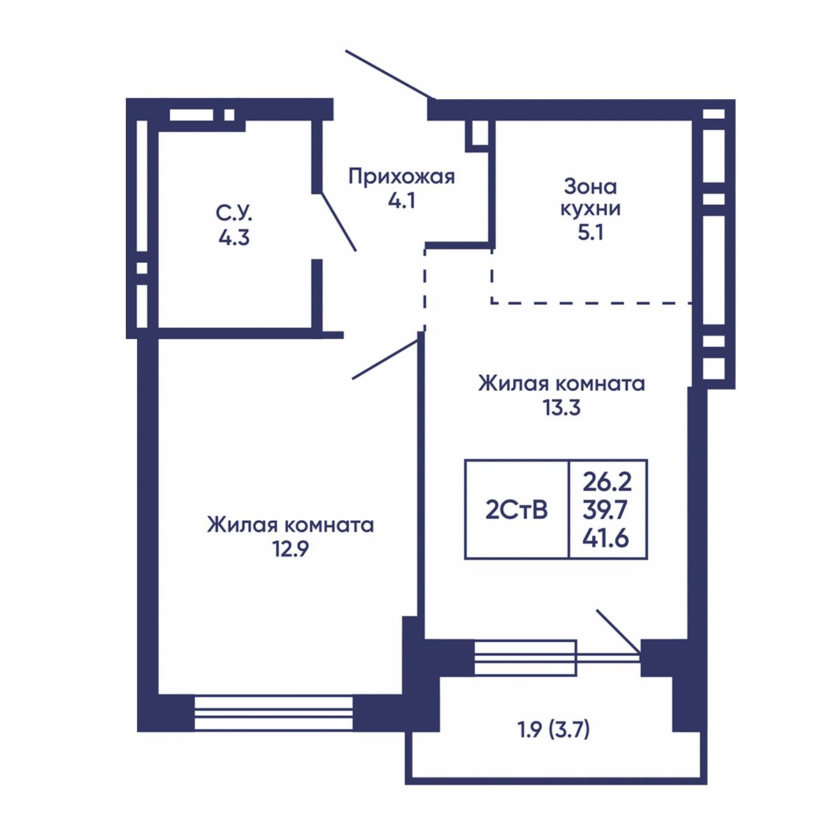 Общая площадь: 41.6 м²