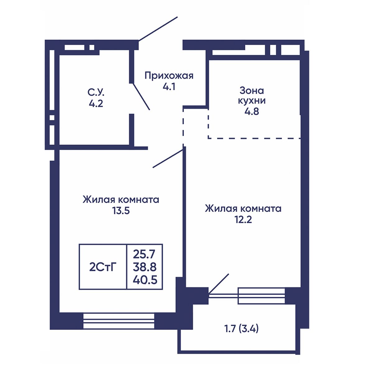 Общая площадь: 40.5 м²