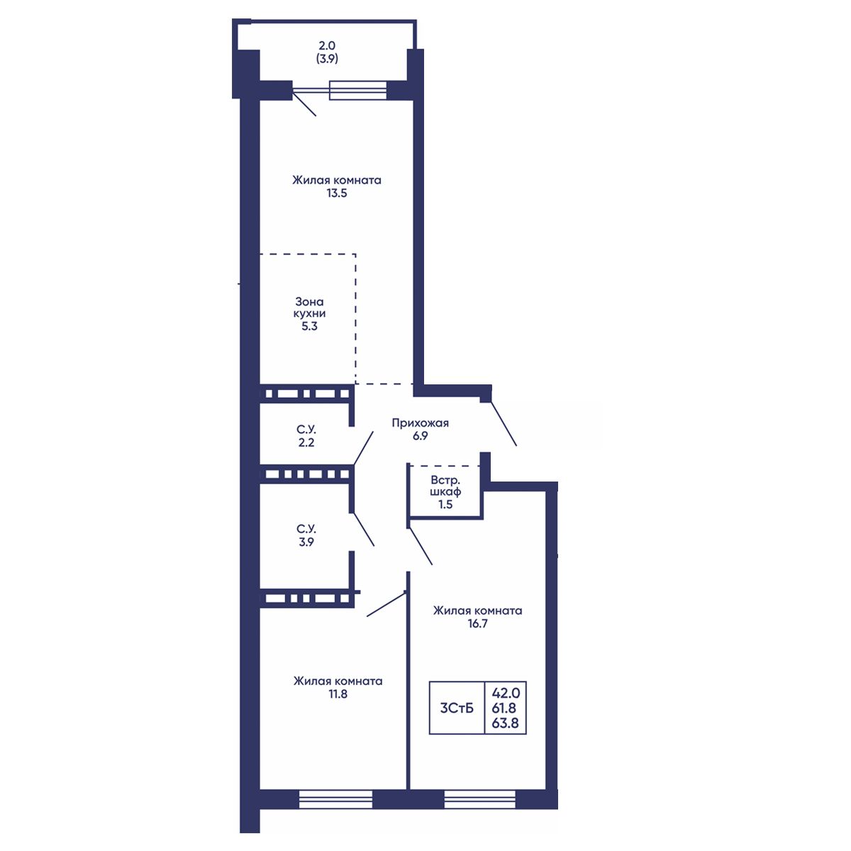 Общая площадь: 63.8 м²