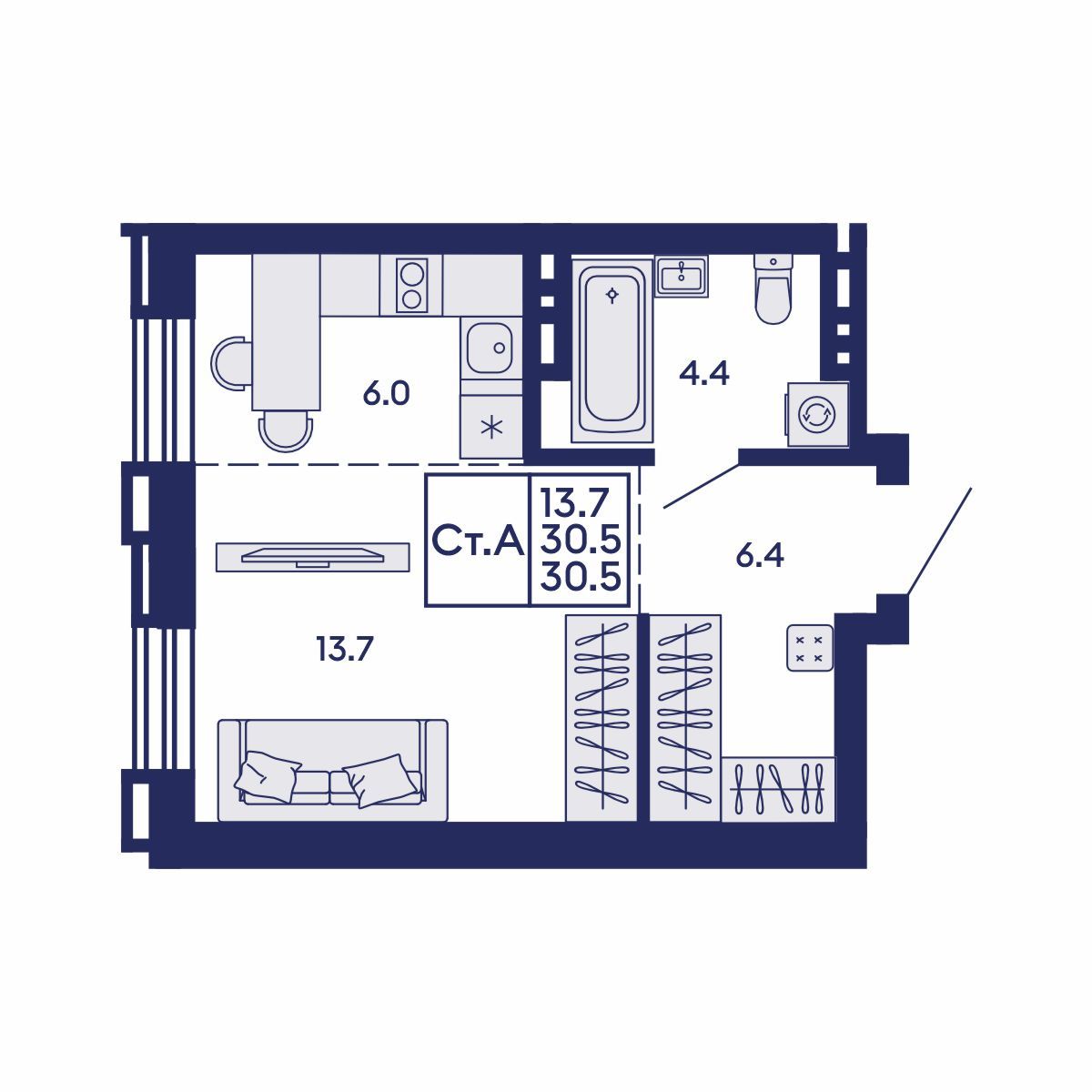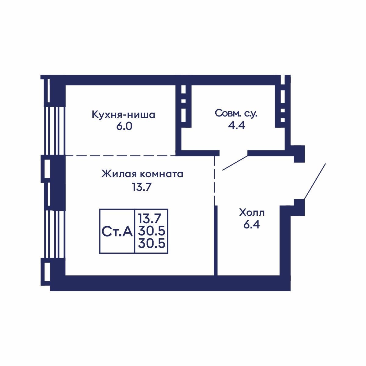 Общая площадь: 30.5 м²