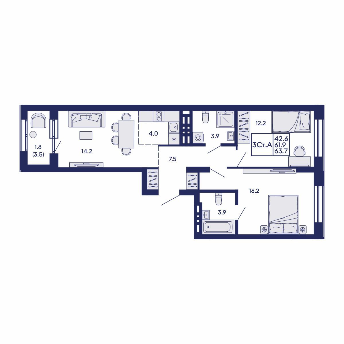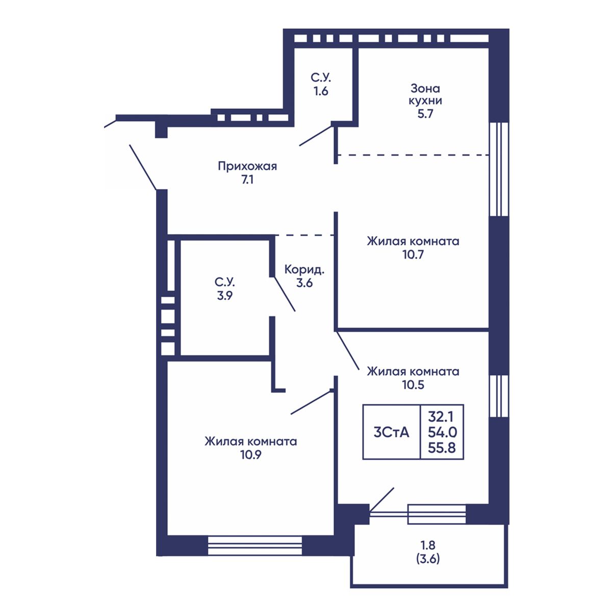 3-комнатная квартира 63.7 м² №381