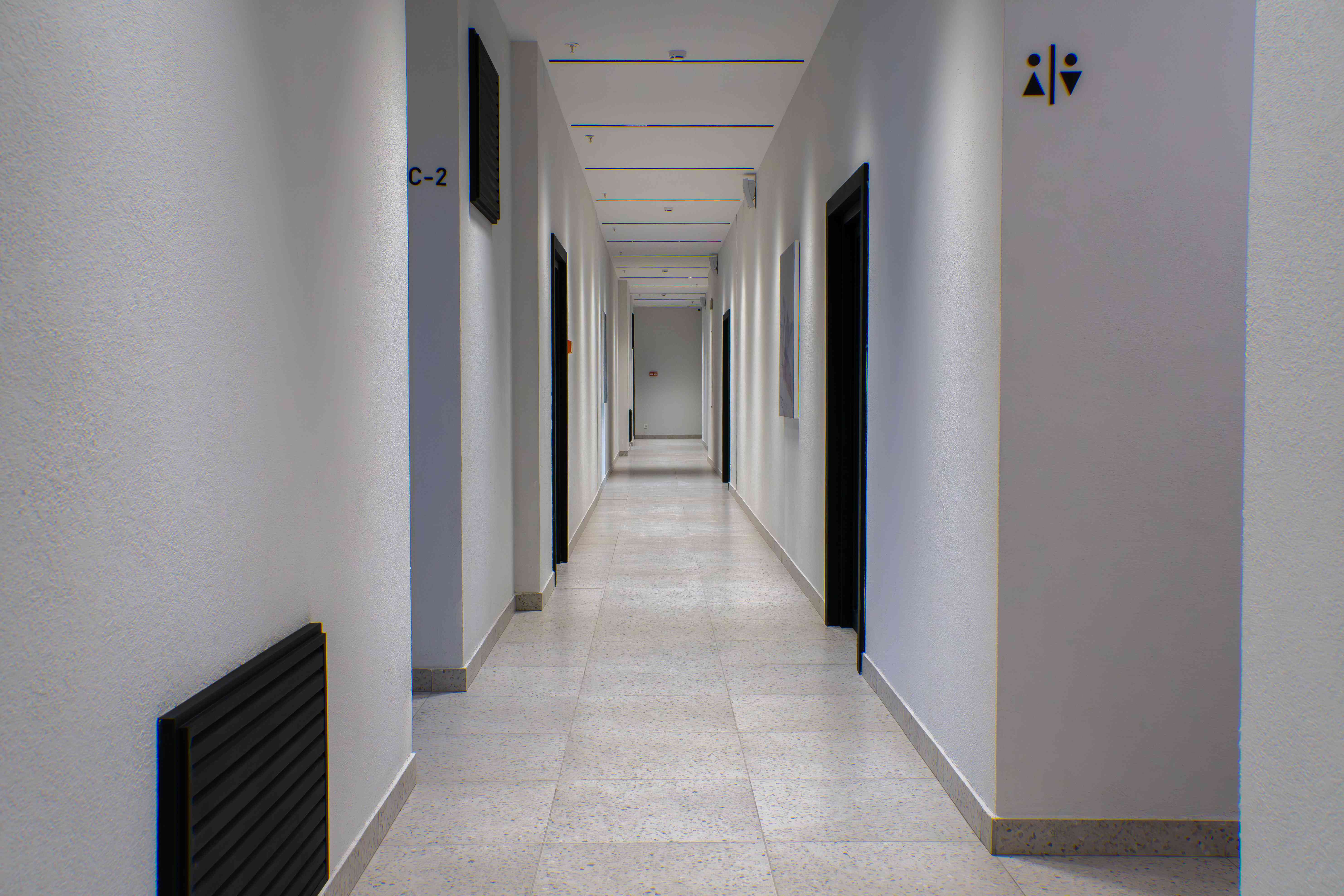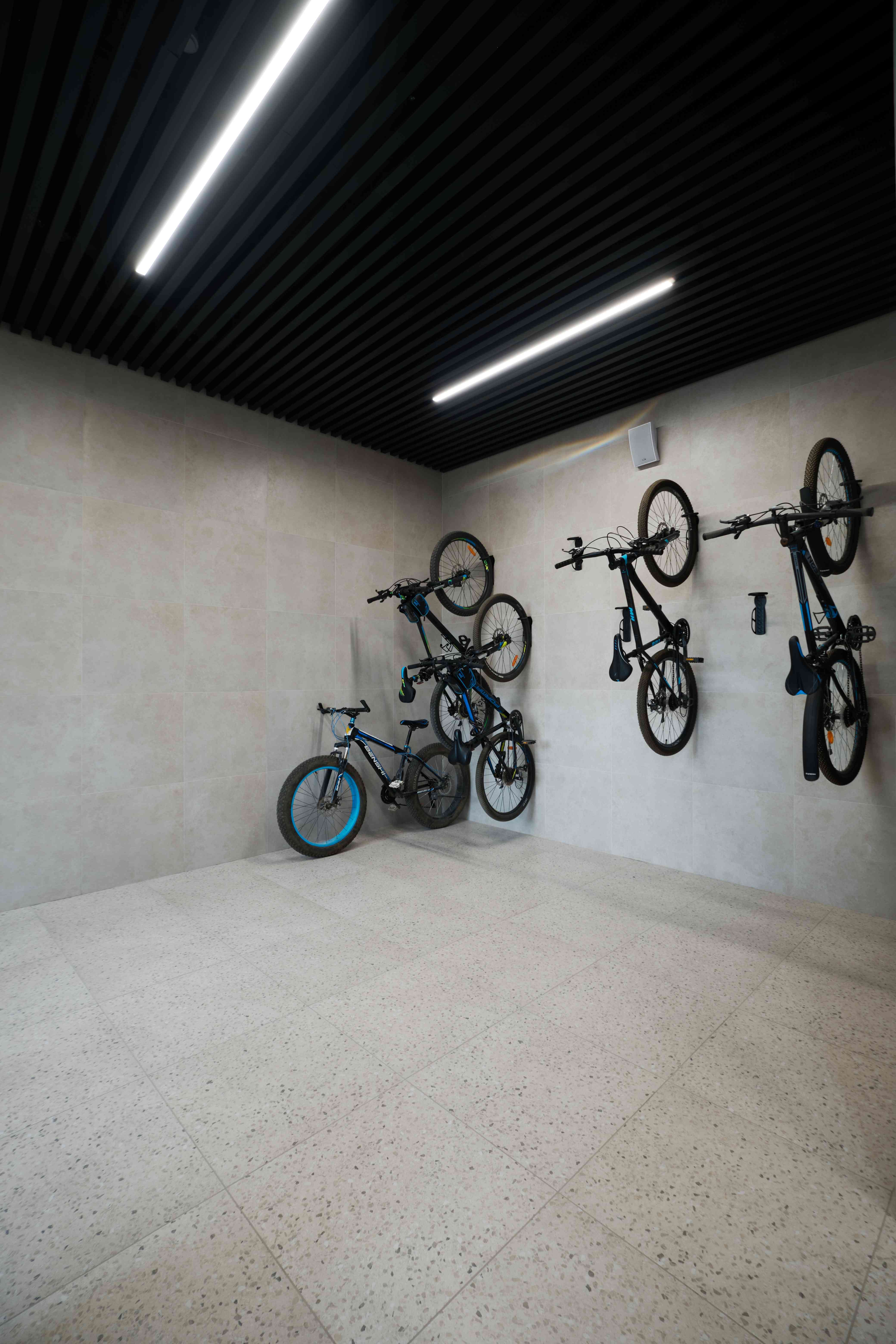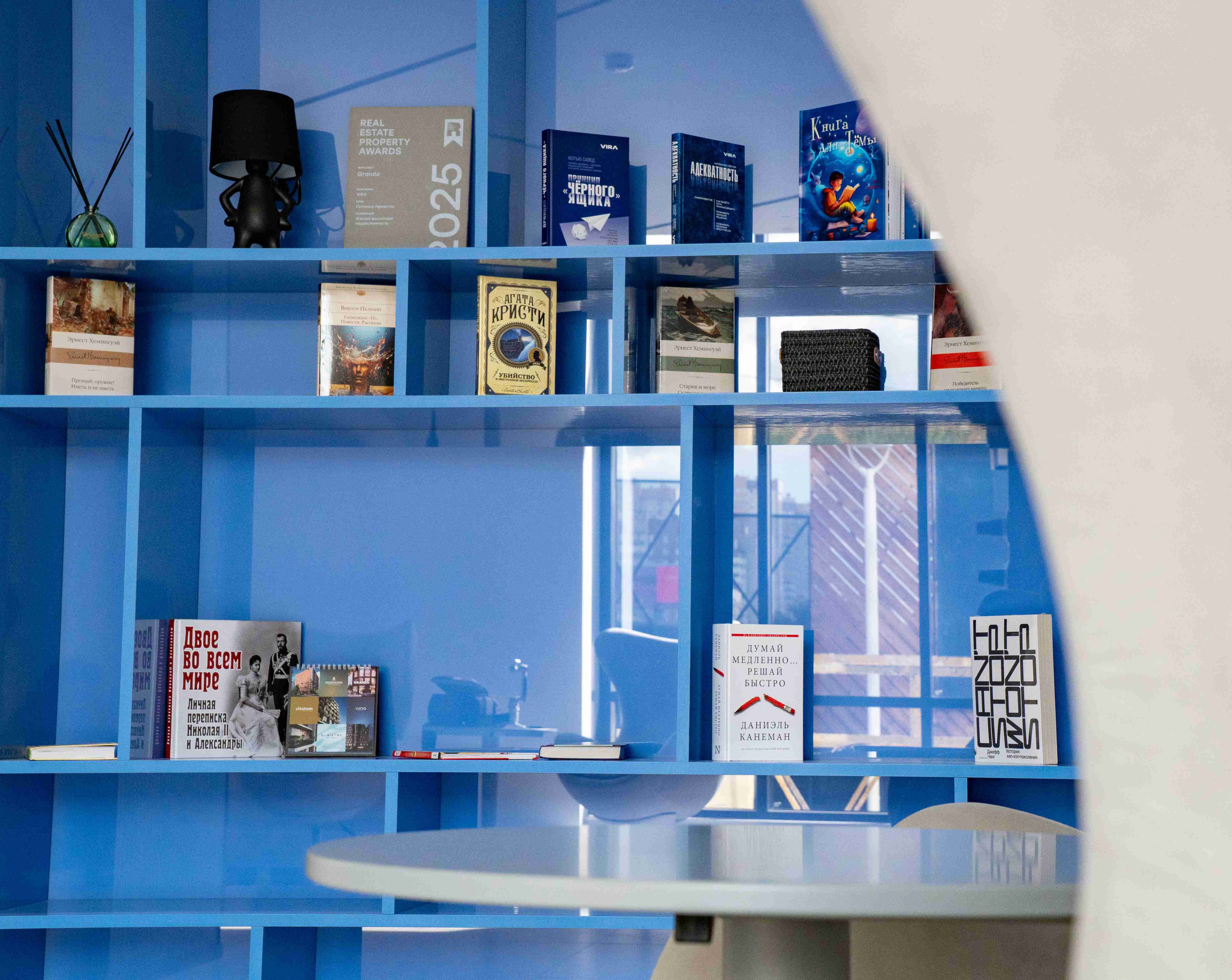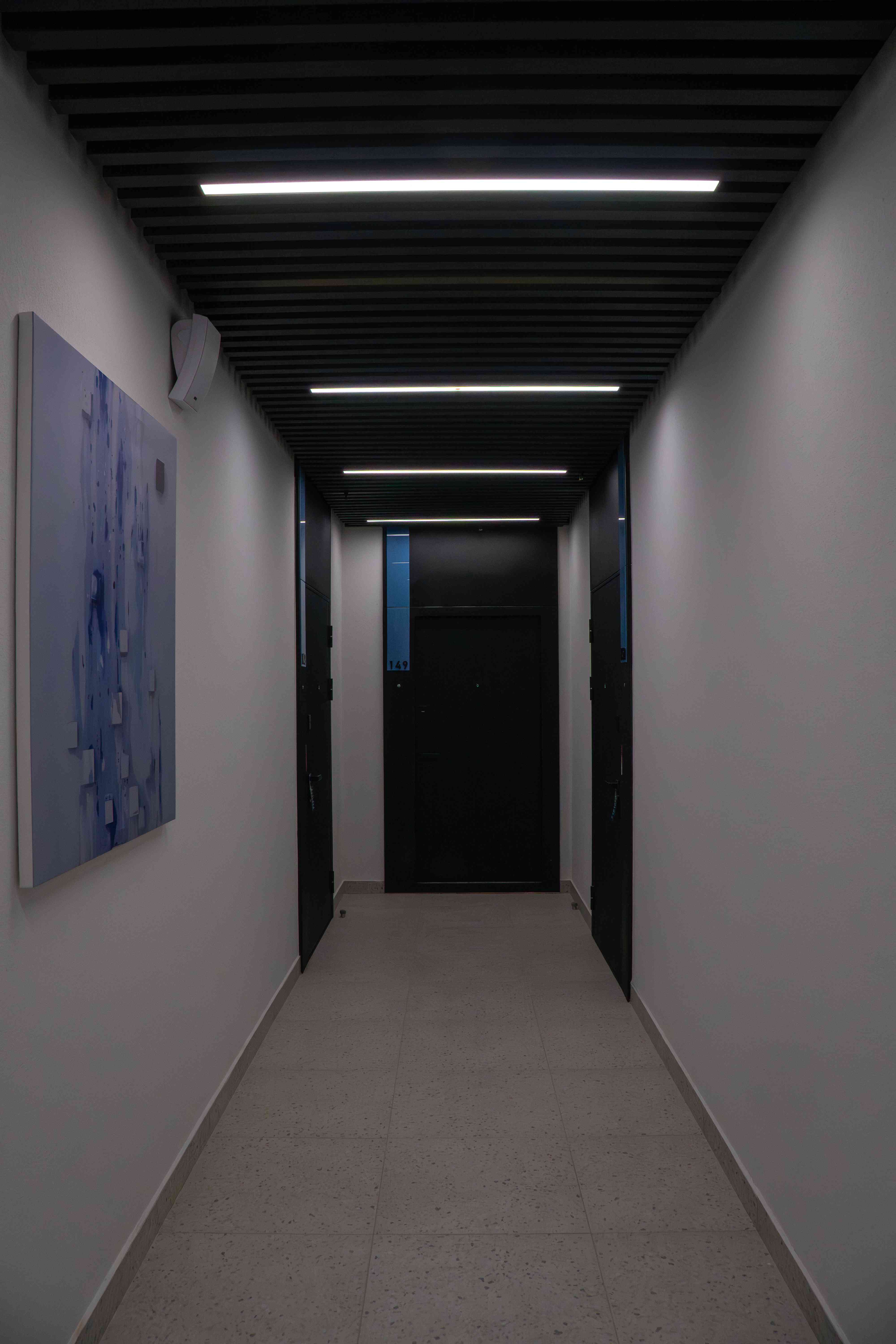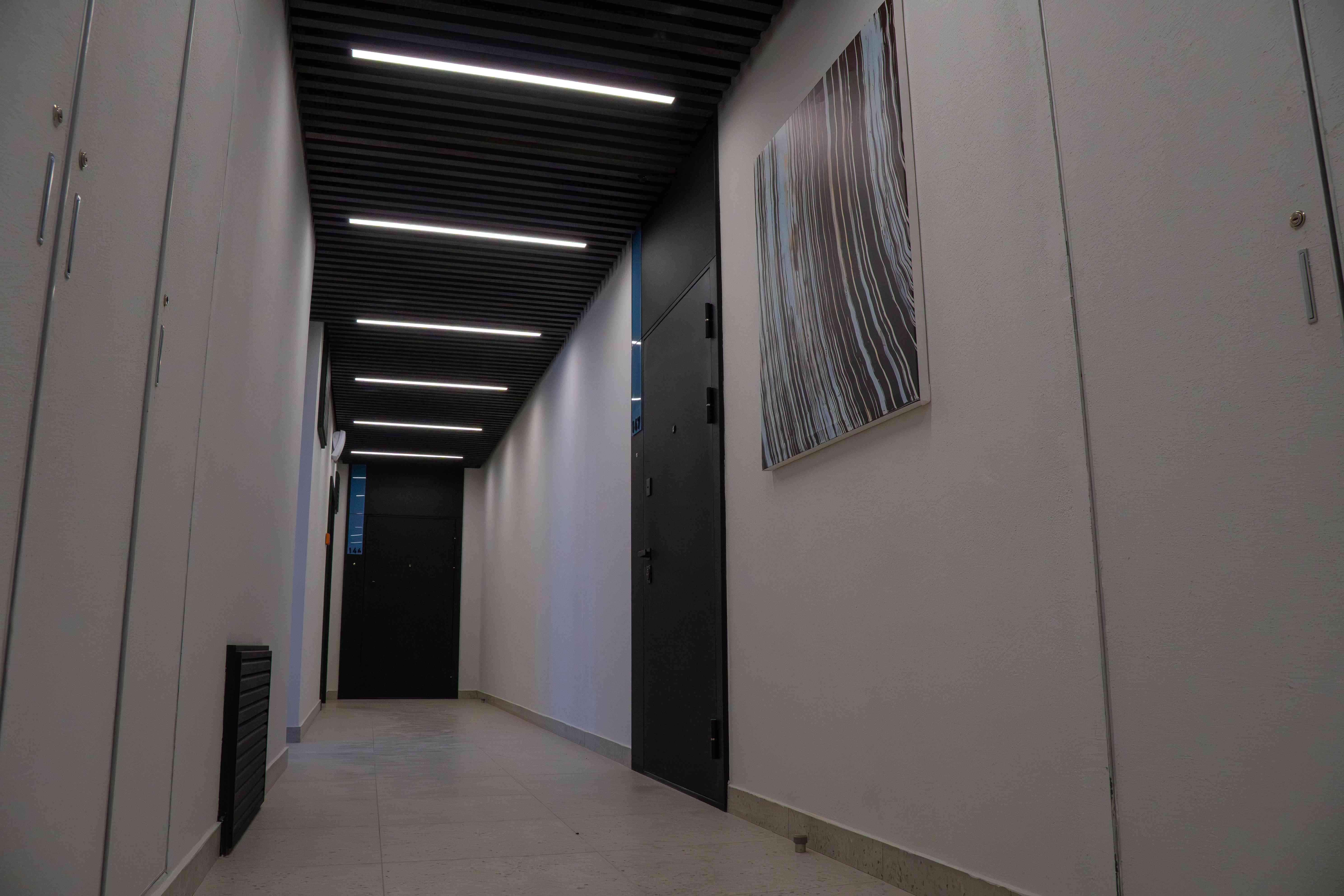 Все секции жилого комплекса объединены в коридорную систему с организацией центрального «лобби» с зоной ресепшн. Футуристичный дизайн и нестандартные системы освещения создают в лобби красивые пропорции и интересные световые сценарии. Фактурные поверхности отделочных материалов и тканей гармонично сочетаются с синей отделкой и терракотовой мебелью.