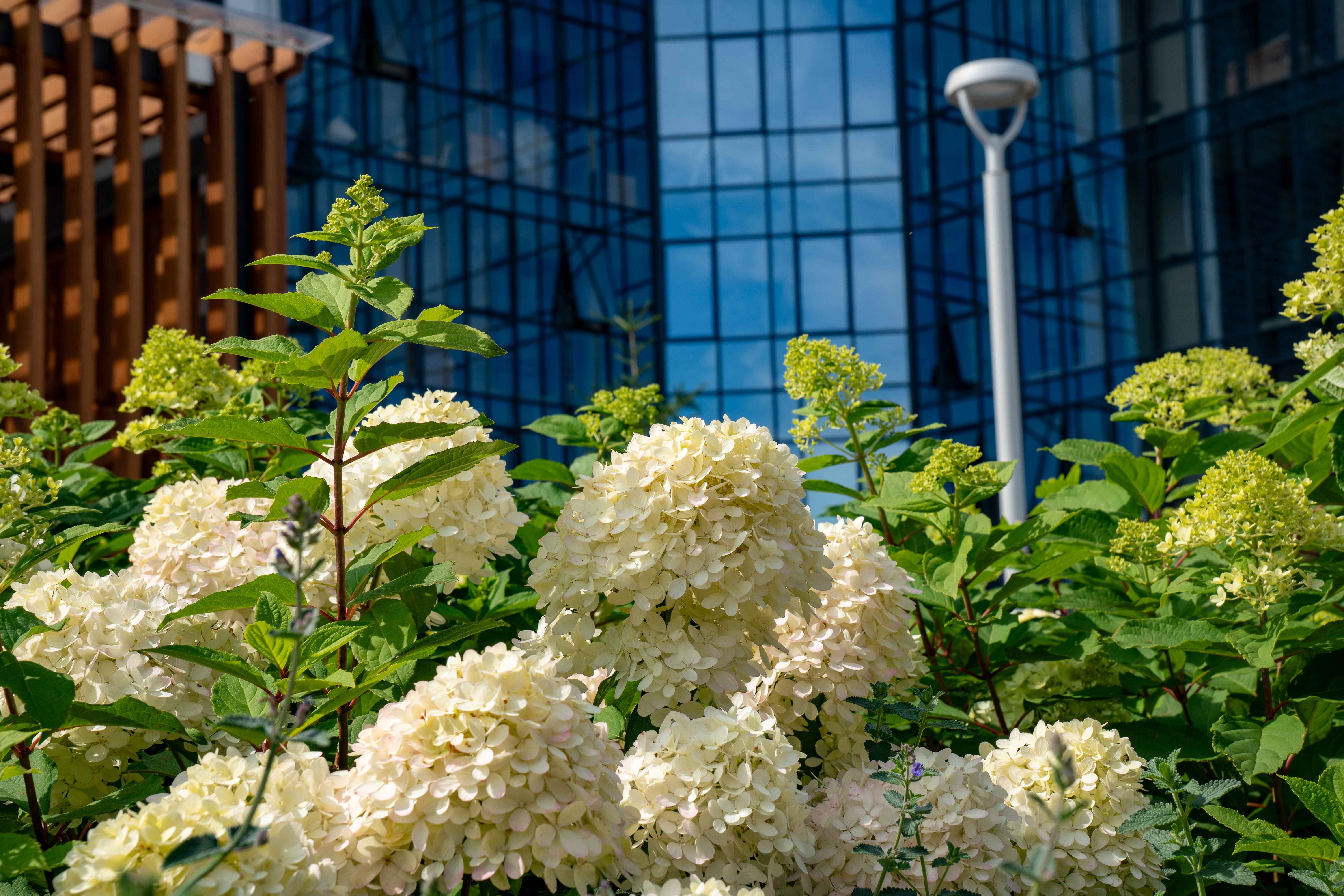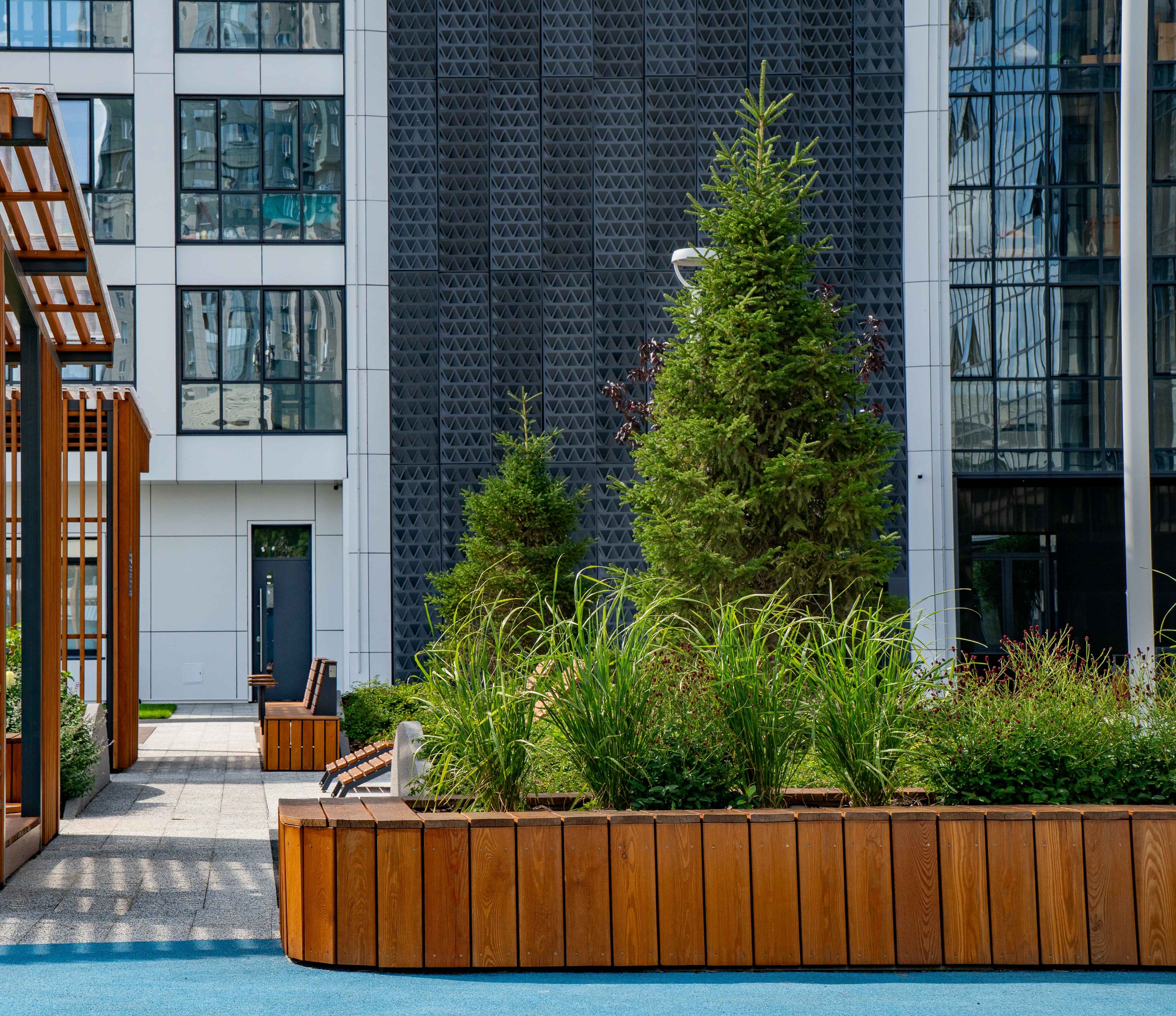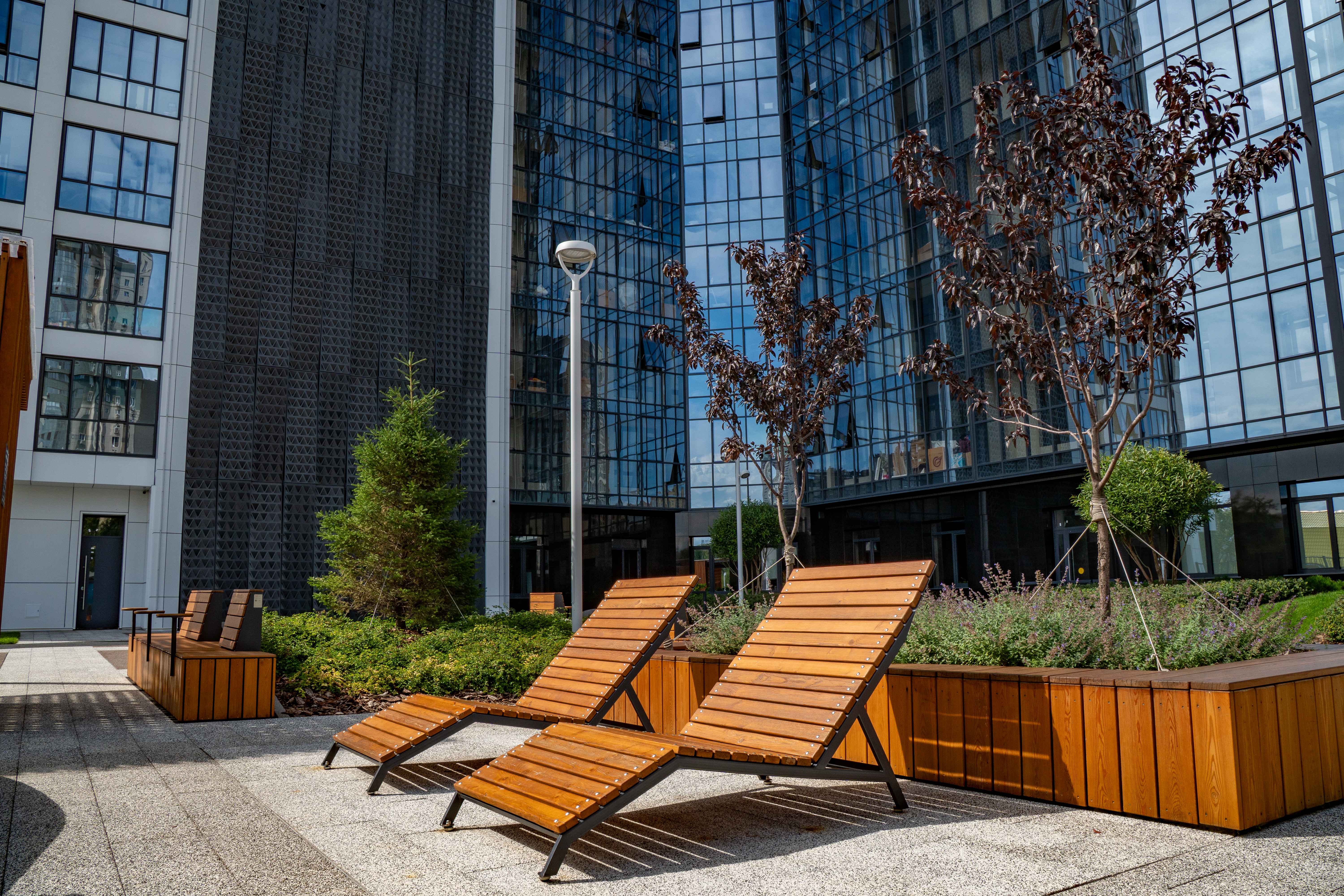 Центр двора – «место встреч» под навесом с амфитеатром для проведения мероприятий и большим столом для возможности поработать или собраться компанией. В остальной части двора также организованы уютные места отдыха: место с лежаками, спрятанное среди злаковых культур, и зона в каменном саду.