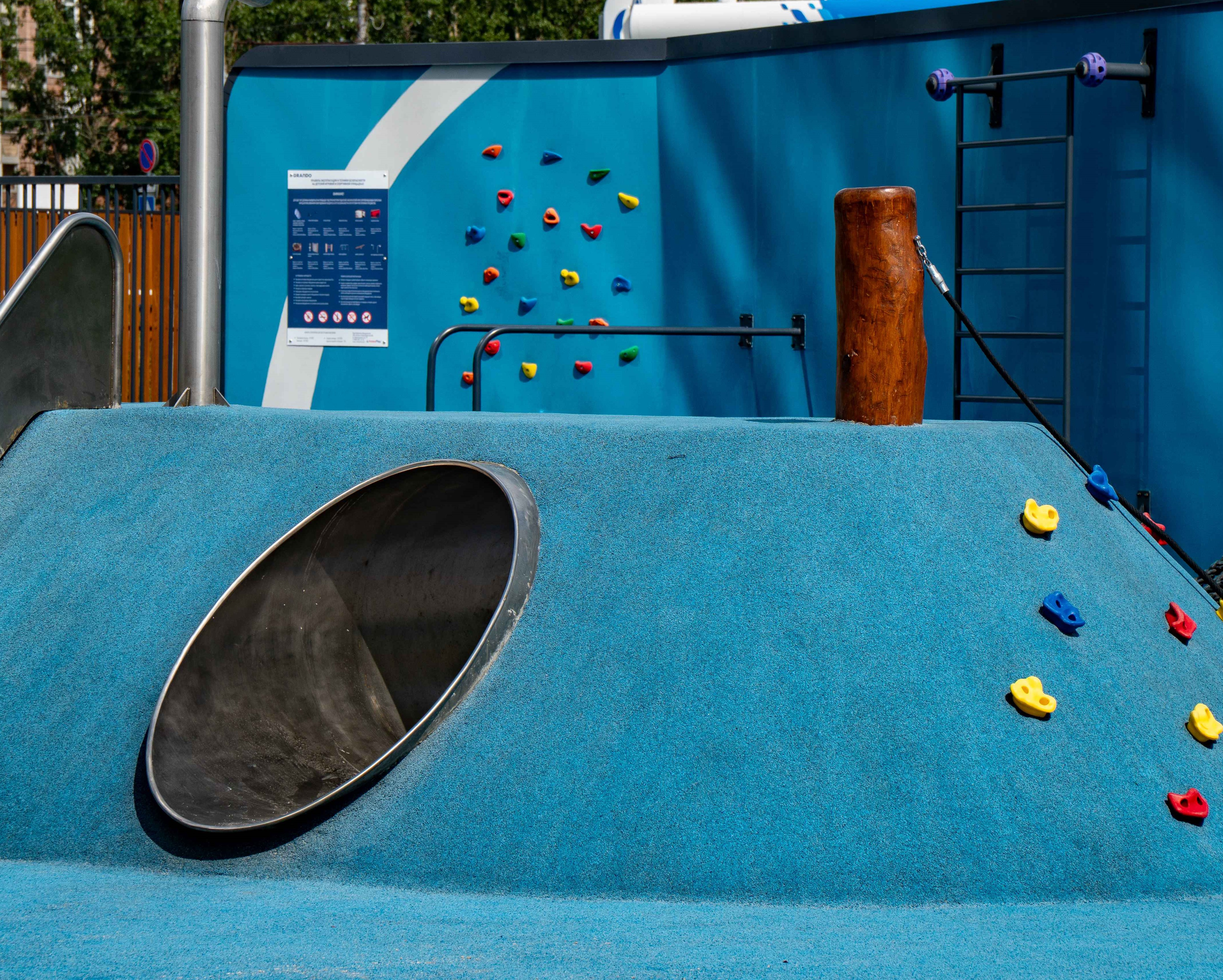 Рядом с детскими игровыми площадками продуманы зоны отдыха для родителей и зона воркаута. Спортивная зона сформирована за счет вертикальной стены, наполненной различными спортивными функциями. Стена также является элементом арт-объекта с абстрактной графикой.