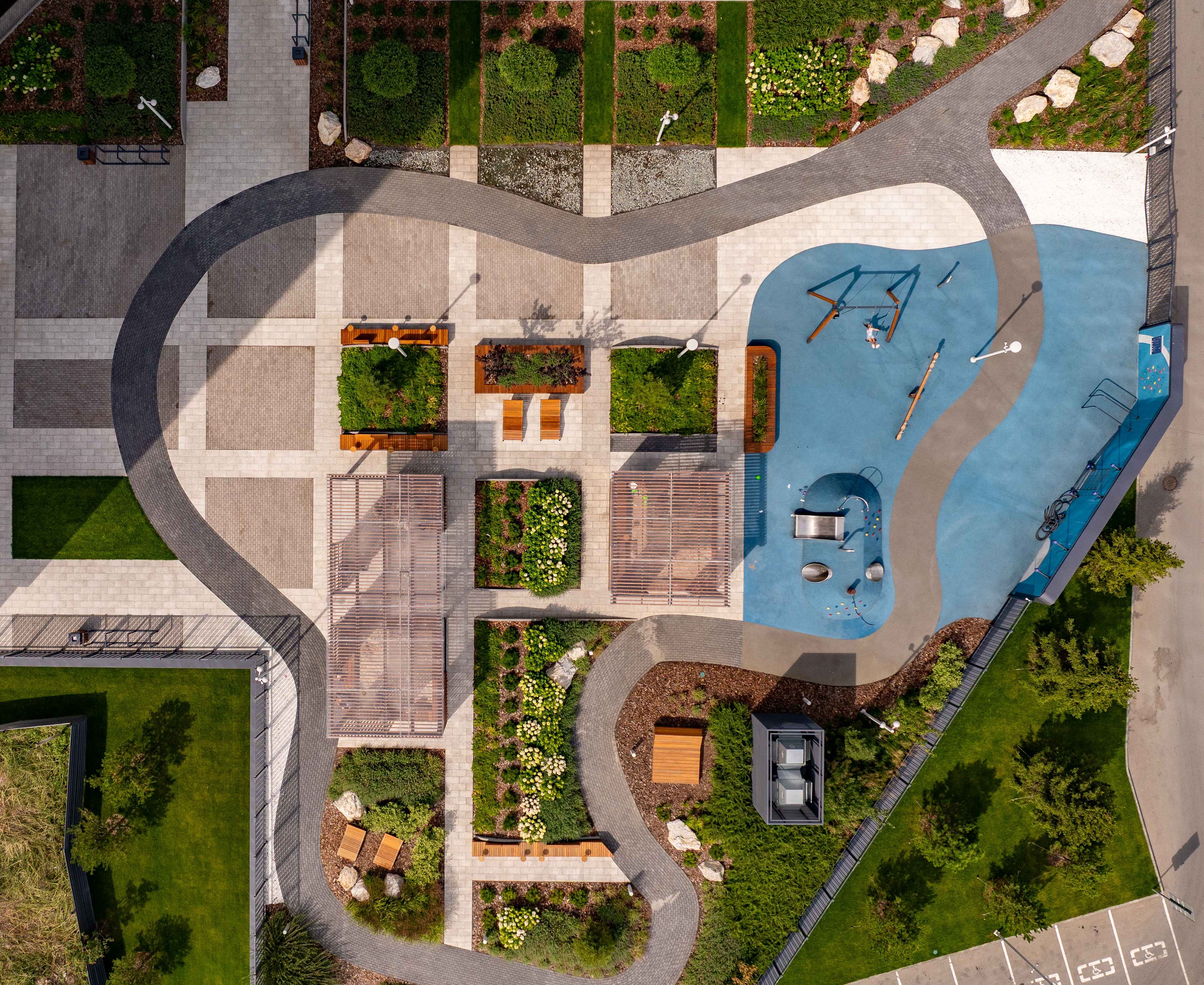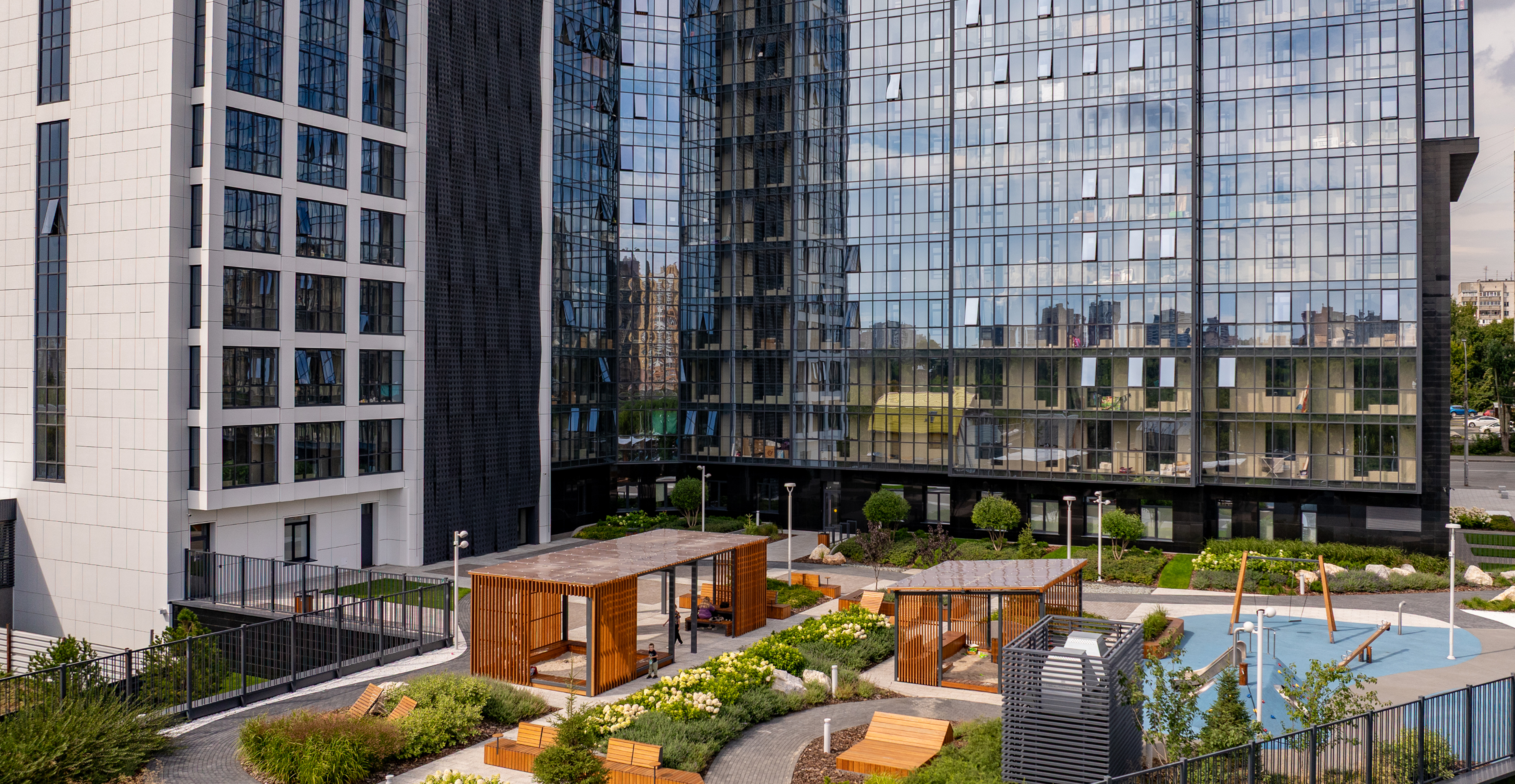 Качели, песочницы, карусели, игровые и развивающие интерактивные комплексы – игровые площадки оборудованы всем, что позволит проводить время с детьми с удовольствием и в безопасности. Игровые разделены по возрастам и видам активностей. Под навесом – для малышей с песком, бизибордами и безопасными качелями, рядом – качели для всех возрастов. Центр активных игр – холм с тоннелем, горкой и зацепами.