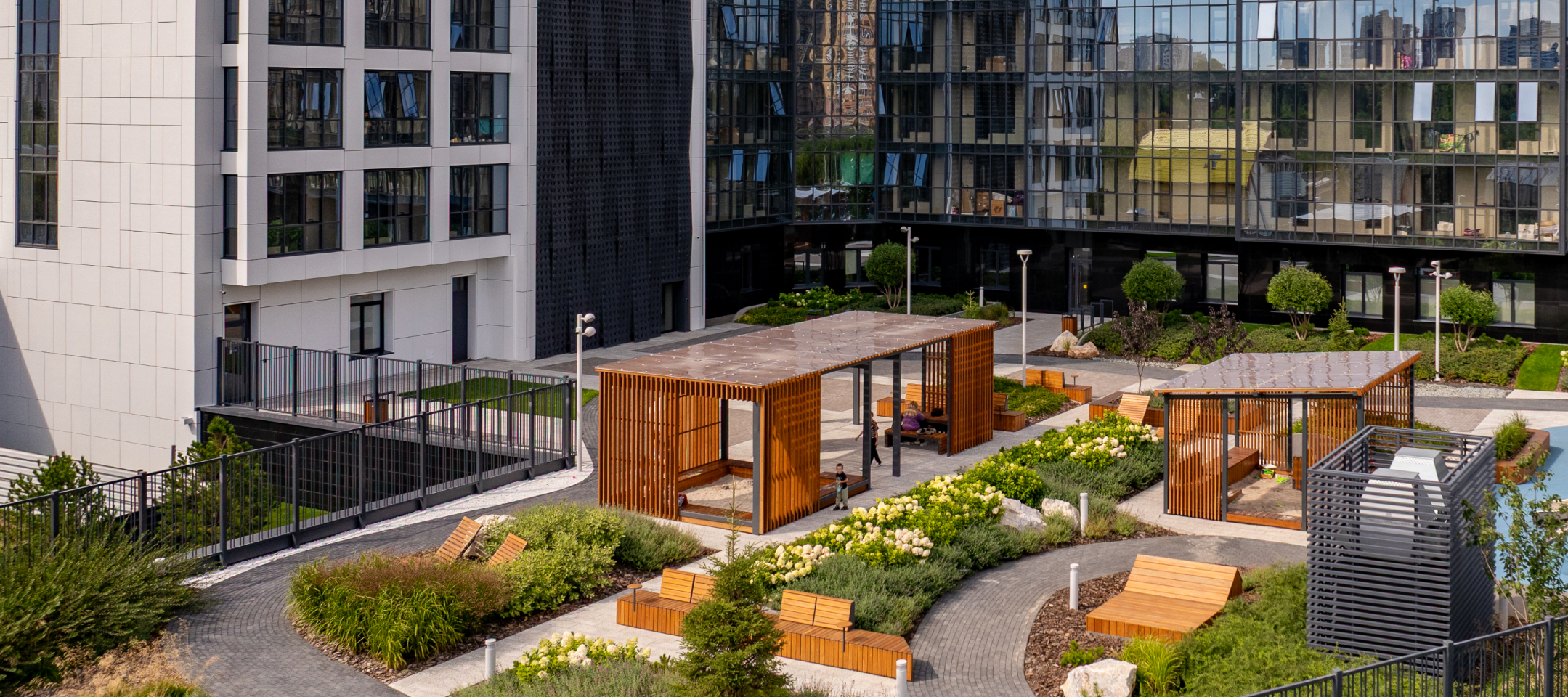 Основной идеей концепции благоустройства является, создание атмосферы уютного ландшафтного «парка» в городской среде с разнообразной насыщенной инфраструктурой для жителей жилого комплекса. Четкая структура геометрии двора сохраняет пространство понятным человеку, а плавная извивающаяся тропинка, привносит элемент открытости и свободы.